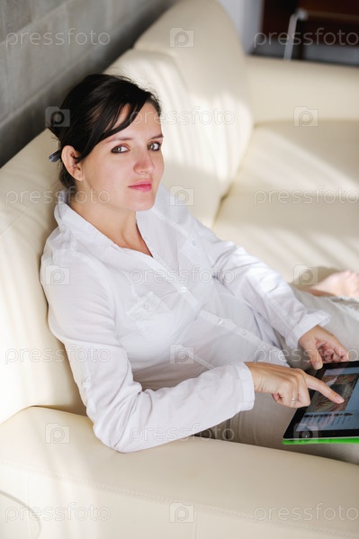 Женщина с планшетом сидит на диване