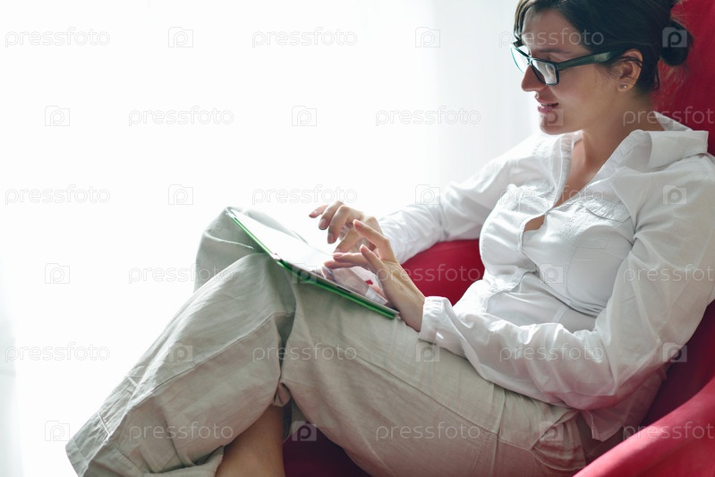 Женщина с планшетом сидит в кресле