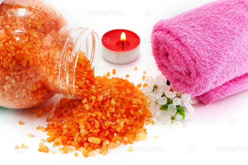 Морская соль для ванны, маленький белый цветок, горящая свеча и розовое полотенце на белом фоне
