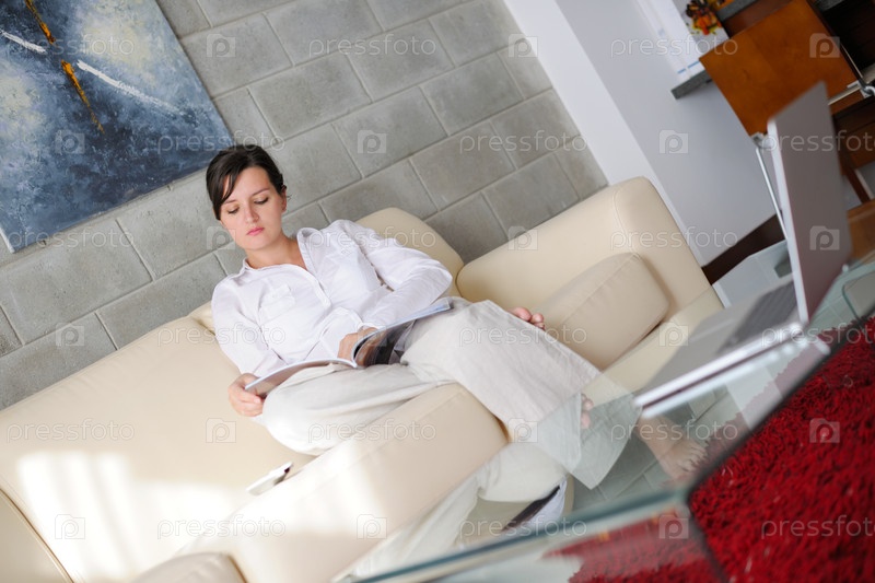 Женщина читает журнал на диване