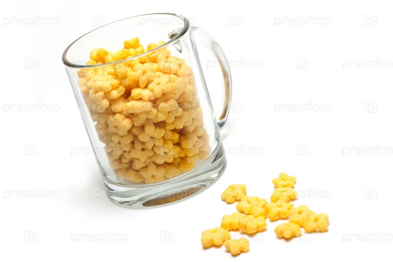 Стеклянная чашка с полной сухой утренней едой, выбросить хлопья на белом фоне