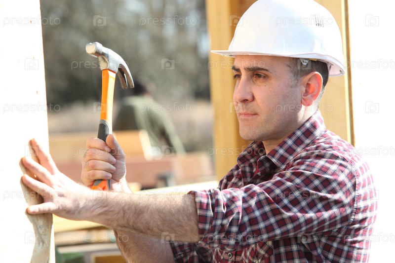 Рабочий забивает гвоздь