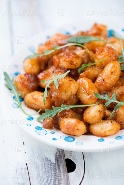 Ньокки с томатным соусом и салатом руккола крупным планом