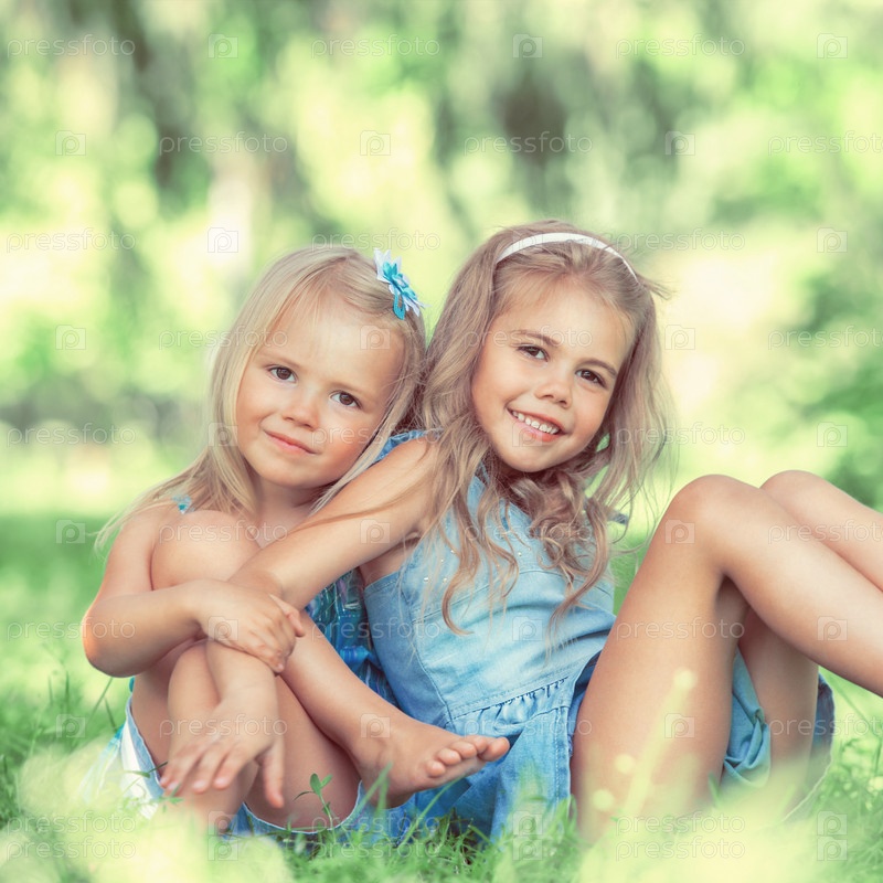 Две милые девочки на лужайке в парке