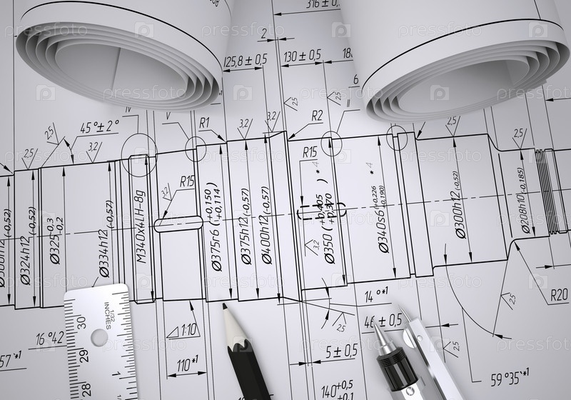Свитки инженерных чертежей и инструменты