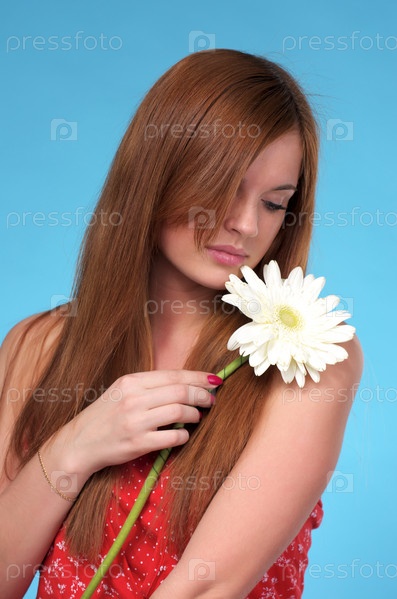 Портрет красивой молодой женщины с белым цветком на синем фоне