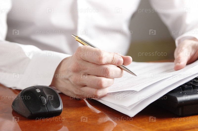 Мужская рука с авторучкой над документом рядом с клавиатурой