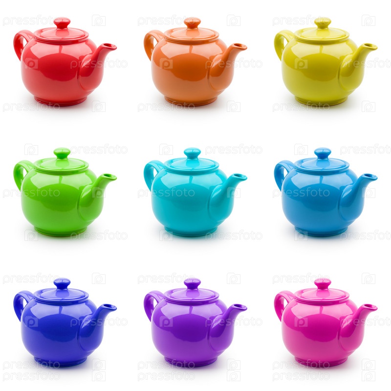 Набор из девяти ярких заварочных чайников. Изоляция на белом