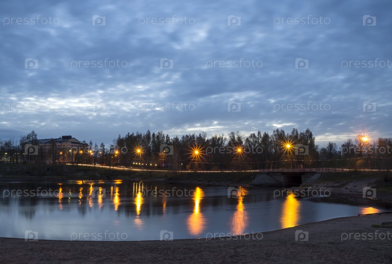 Городской мост через речку ночью