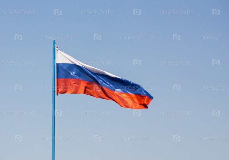Флаг России в голубом небе на флагштоке