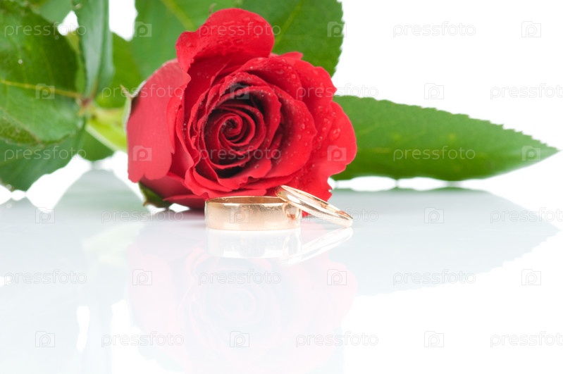 Красная роза и два золотых обручальных кольца