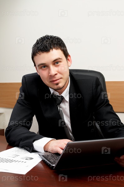 Молодой бизнесмен, работающий на ноутбуке в офисе