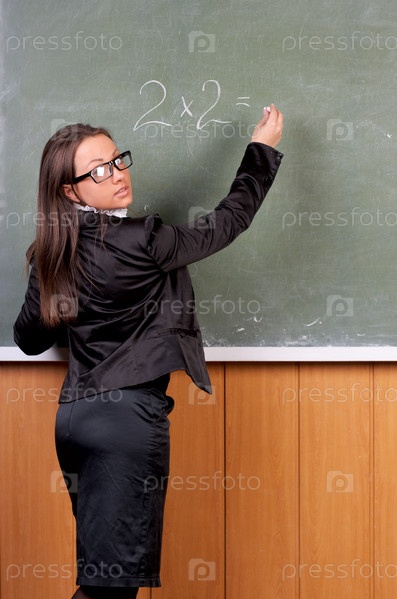 Молодая учительница пишет на доске