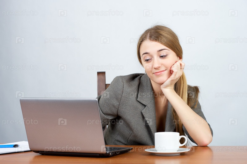 Молодая девушка, улыбаясь смотрит в экран ноутбука