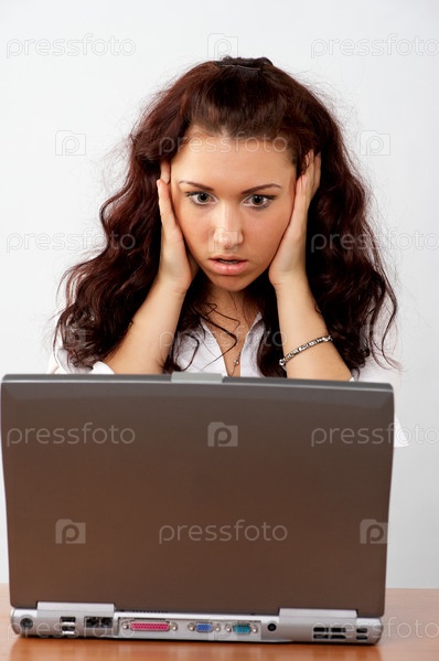 Молодая девушка с ужасом смотрит в экран ноутбука