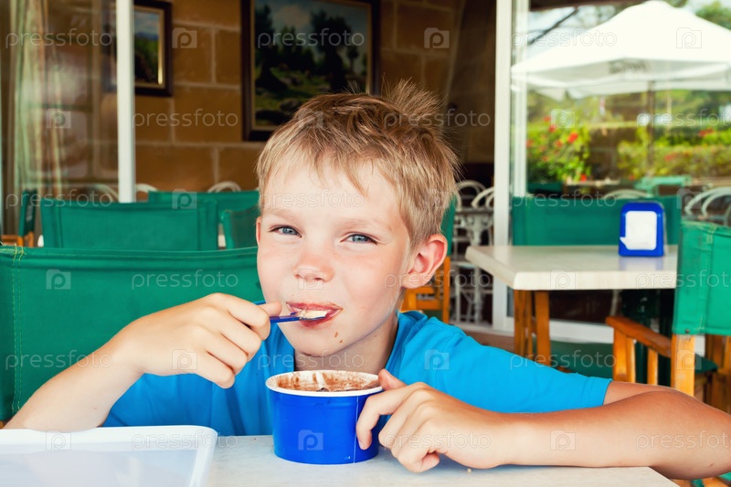 Мальчик ест мороженое