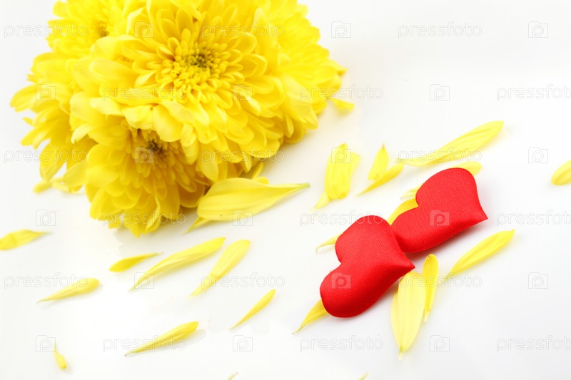 Желтые хризантемы с двумя красными сердцами на белом фоне