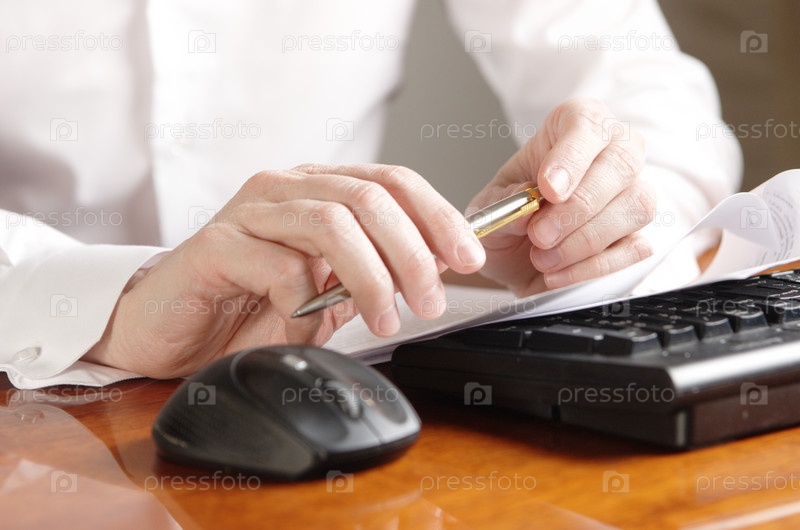 Руки бизнесмена с авторучкой над клавиатурой компьютера