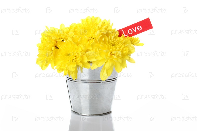 Желтые хризантемы с открыткой в ведерке на белом фоне