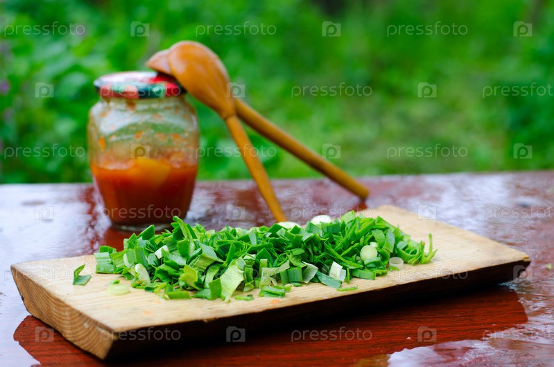 Нарезанный зеленый лук, деревянные ложки и банка с перцем