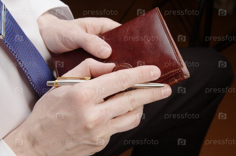 Бизнесмен держит кожаный бумажник и авторучку