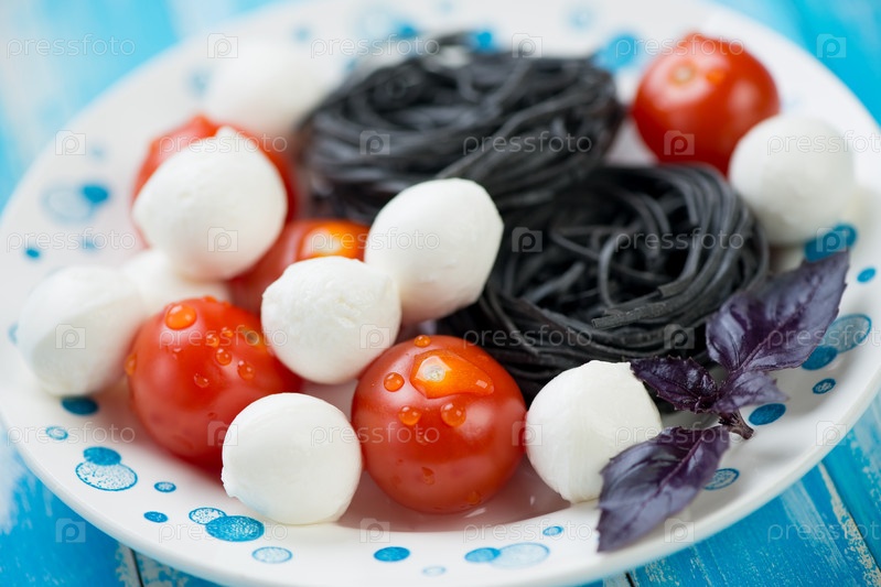 Помидоры черри, моцарелла, черные тальятелле, базилик