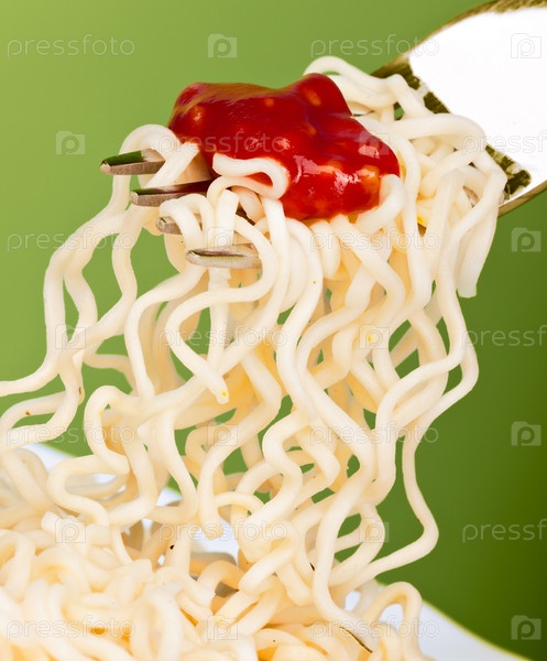 Китайская лапша с кетчупом крупным планом