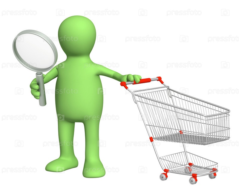 Человечек с лупой и пустой магазинной тележкой