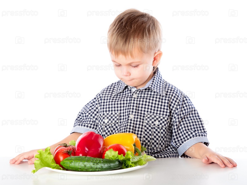 Мальчик с тарелкой свежих овощей на белом фоне