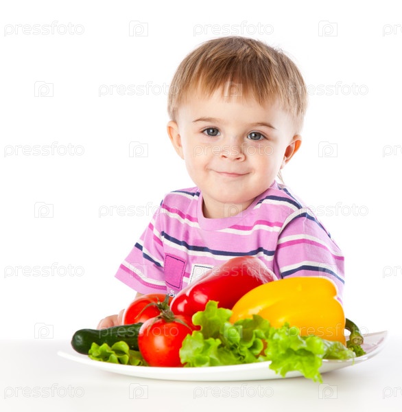 Мальчик с тарелкой свежих овощей на белом фоне