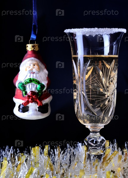 Один стакан шампанского на черном фоне боке с маленьким Сантой