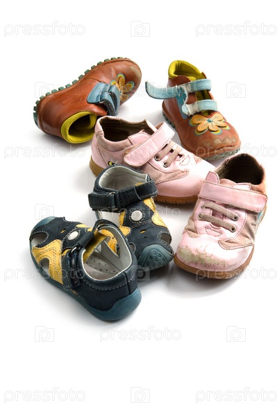 Три пары детской обуви на белом фоне
