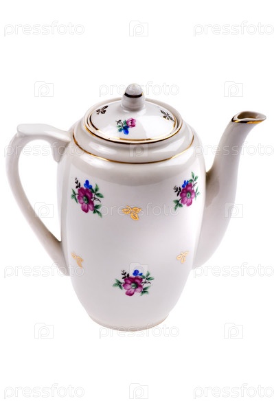 Белый заварочный чайник с цветочным узором на белом фоне