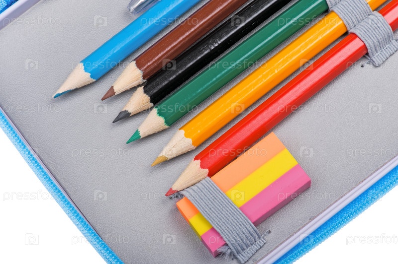 Разноцветные карандаши и ластик в пенале крупным планом на белом фоне