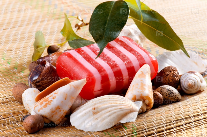 Красное душистое мыло и морские ракушки на тростниковой циновке