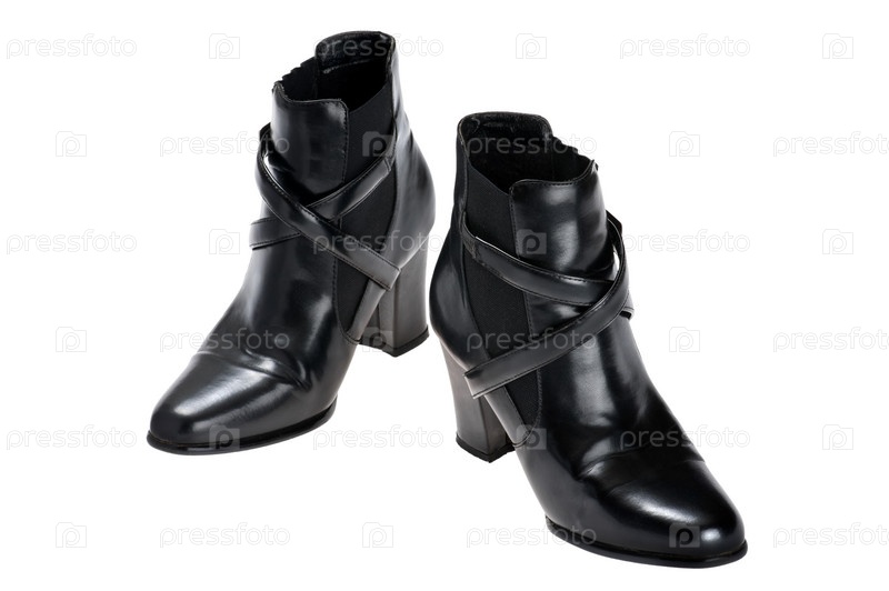Пара женских черных ботинок крупным планом на белом фоне