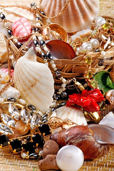 Морские ракушки с ювелирными украшениями на тростниковой циновке