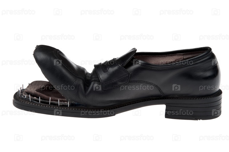 Рваный кожаный ботинок на белом фоне