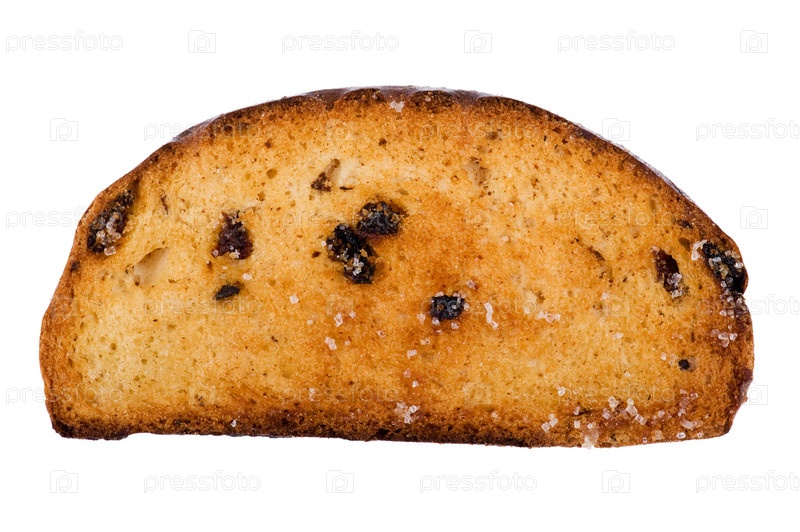 Сухарик с изюмом крупным планом на белом фоне