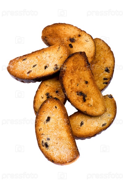 Сухари с изюмом крупным планом на белом фоне