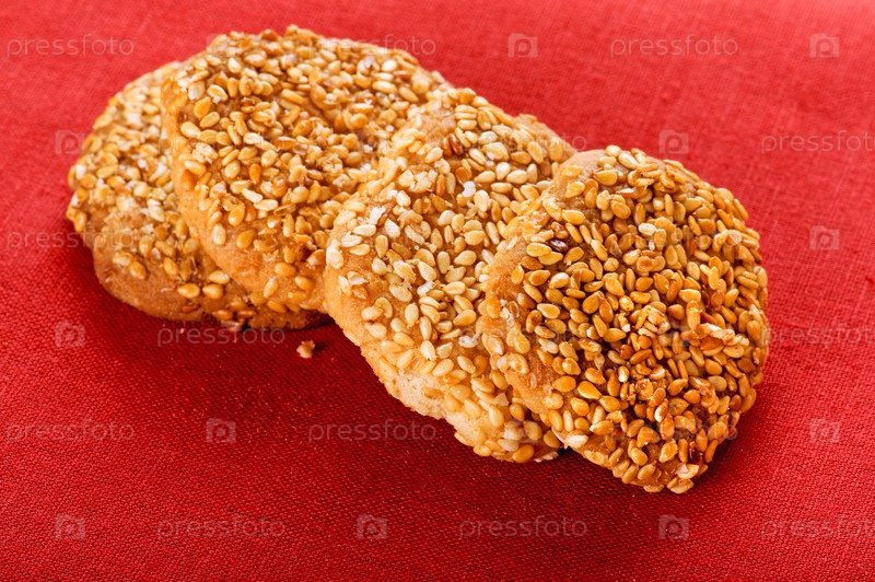 Печенье с кунжутом на красном фоне