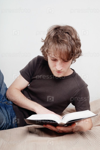 Молодой человек читает книгу на кровати