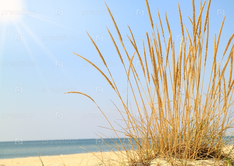Колосья травы на побережье на фоне голубого неба