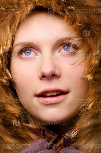 Портрет красивой молодой девушки в красном меховом наряде, которая смотрит вверх