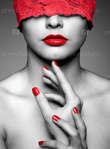 Женщина с красной ажурной лентой на глазах