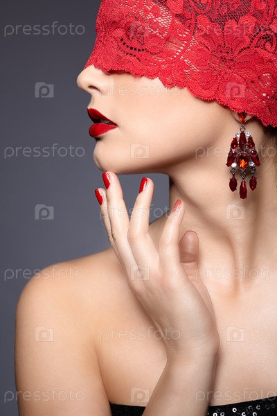 Женщина с красной ажурной лентой на глазах