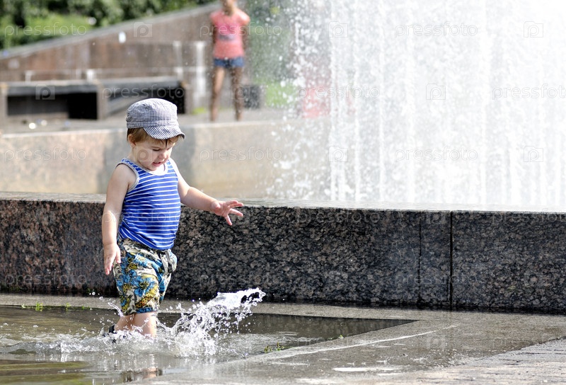 Счастливый ребенок играет в луже воды