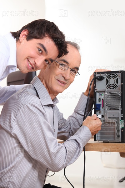 Внук и дед подключают компьютер