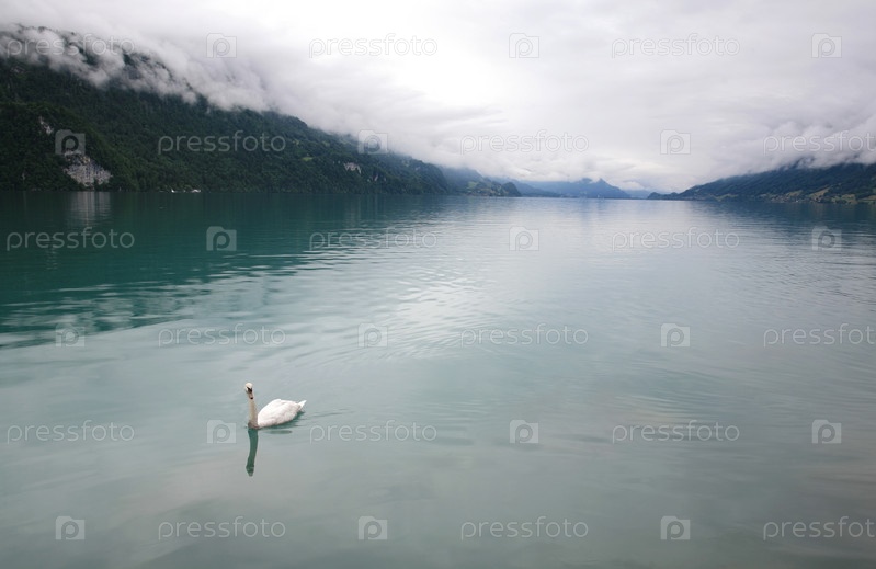Белый лебедь на озере и туман над ним