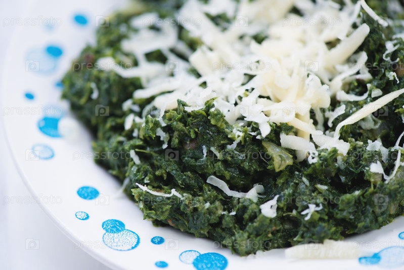 Жареный шпинат с сыром пармезан в тарелке